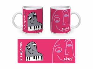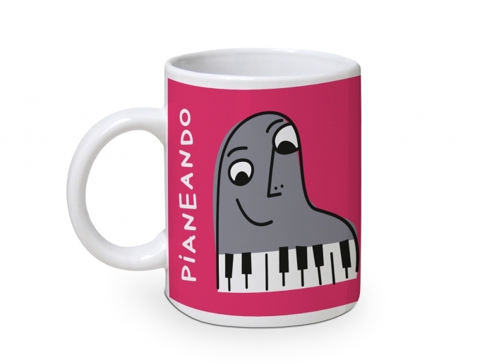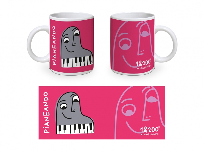 Taza con ilustración de "Pianeando" impresa a todo color.